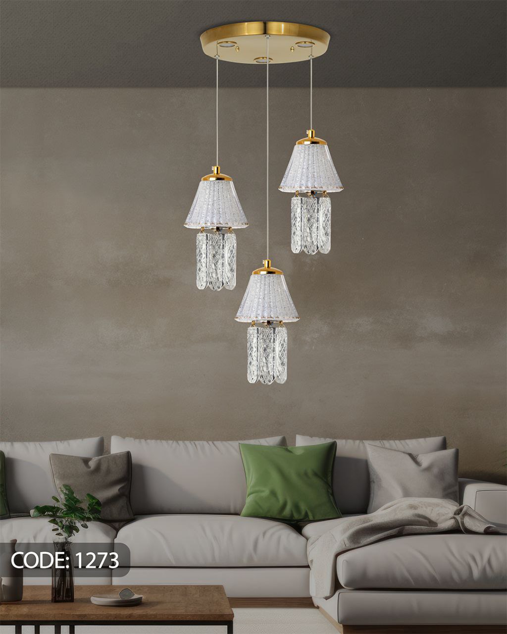 آویز کد 1273 با ترکیب صفحه نصب شونده و سه آویز هم شکل قابلیت تنظیم ارتفاع را دارد و با هر بار کلید خاموش و روشن قابلیت سه حالت نوردهی به صورت (آفتاب/مهتاب/نچرال) و به دلخواه شما را دارد. همچنین بر روی صفحه ی نصب شوند به جز آویز ها 3 عدد LED نصب شده است که در نوردهی بیشتر موثر است.